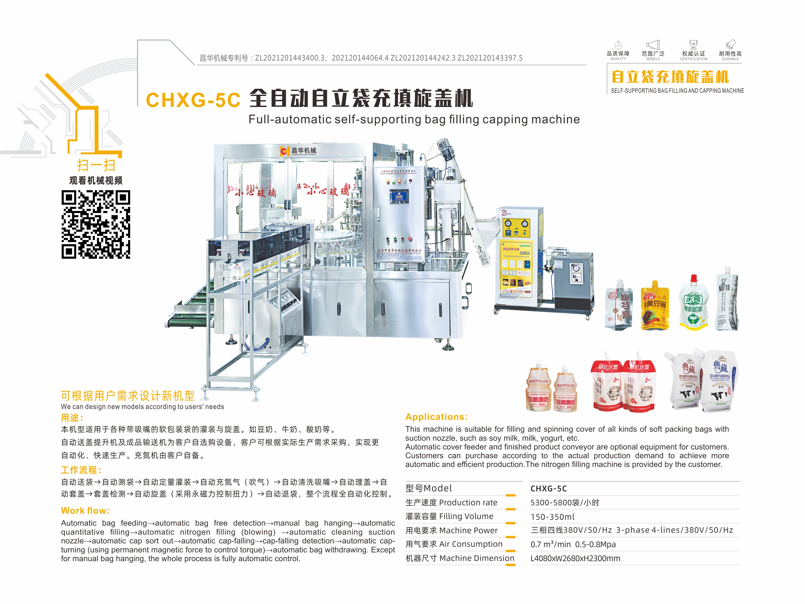 全自動自立袋充填旋蓋機(jī)系列適用于各種帶吸嘴的軟包裝袋產(chǎn)品的灌裝與旋蓋,可根據(jù)用戶產(chǎn)品定制;
