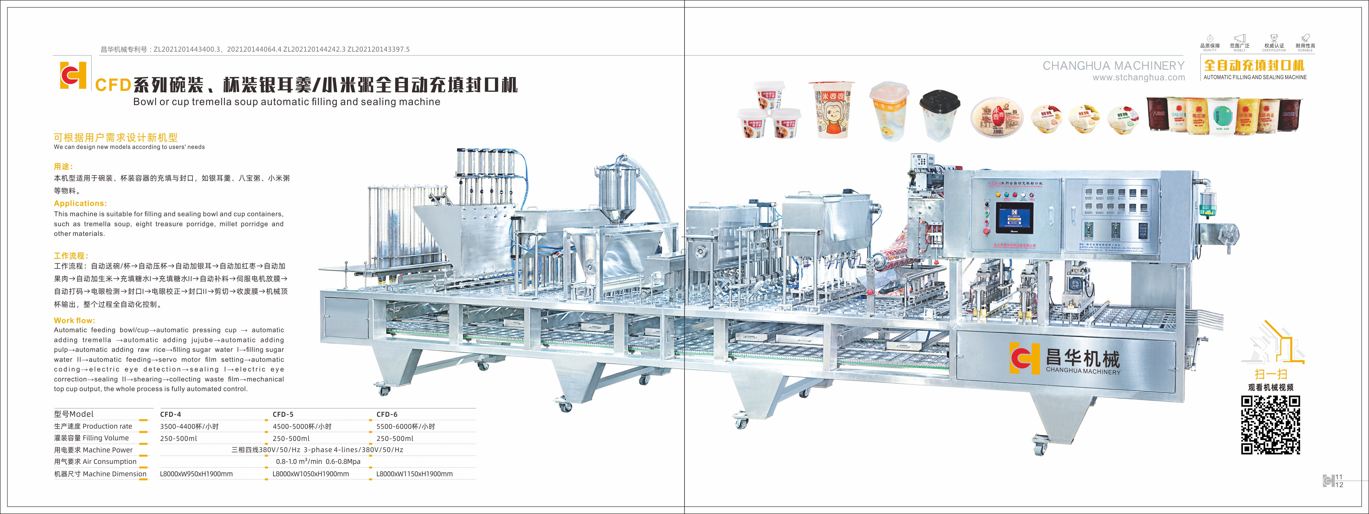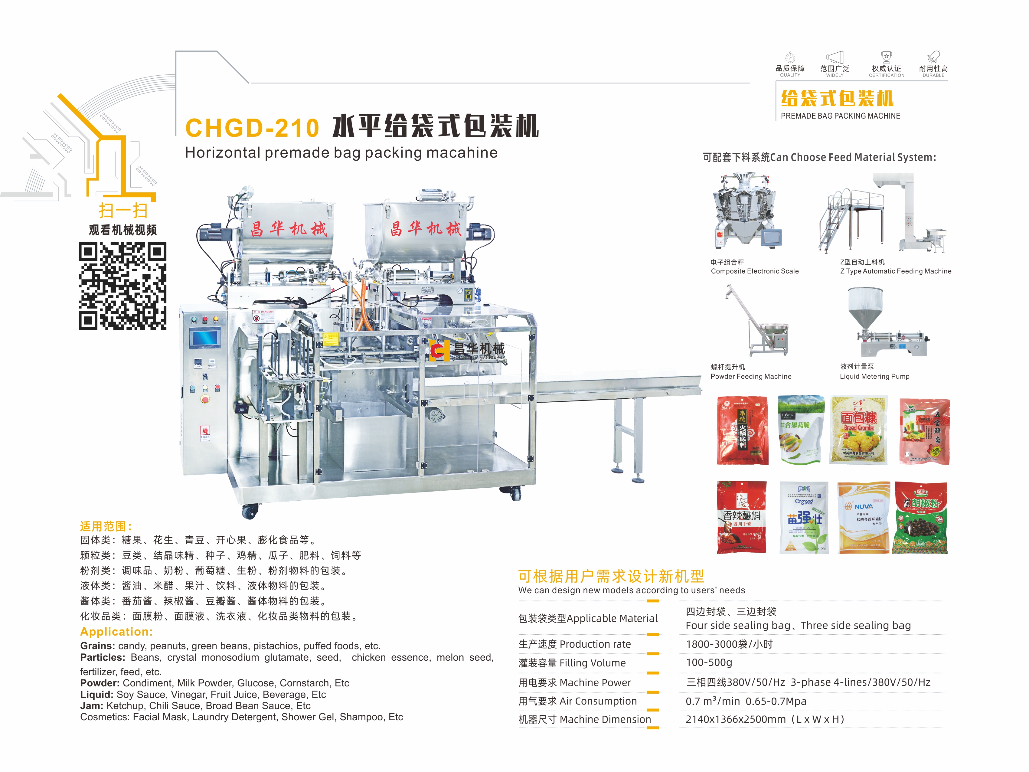 昌華機(jī)械的主要產(chǎn)品包括:充填封口機(jī)系列、自立袋充填旋蓋機(jī)系列、給袋式包裝機(jī)系列、立式包裝機(jī)系列、瓶裝灌裝機(jī)、后道殺菌、包裝生產(chǎn)線系列等。