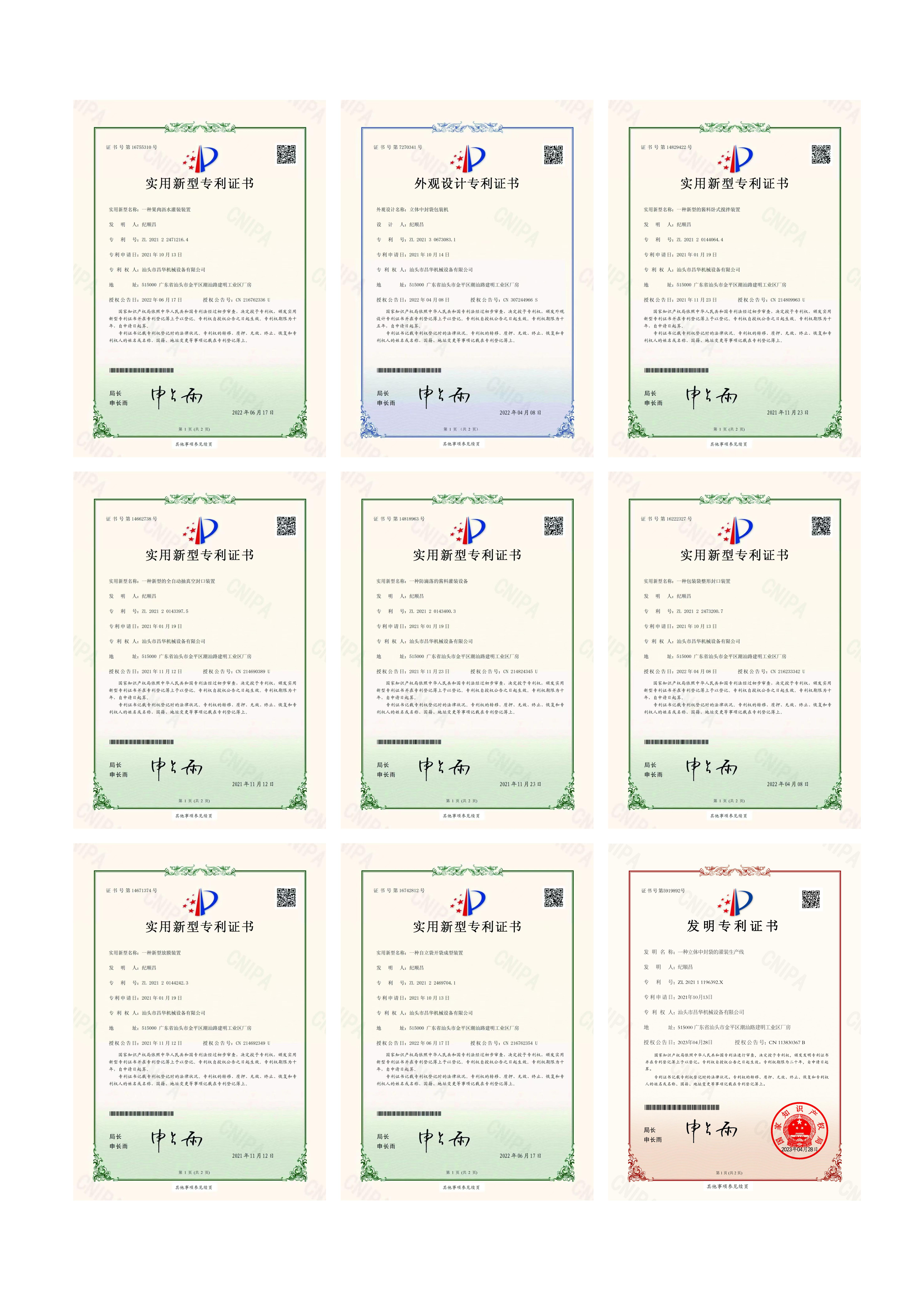 昌華機(jī)械是守合同、重信用、重質(zhì)量企業(yè),目前申請專利9項(xiàng),其中發(fā)明專利1項(xiàng),實(shí)用新型專利7項(xiàng),外觀設(shè)計(jì)專利1項(xiàng)。